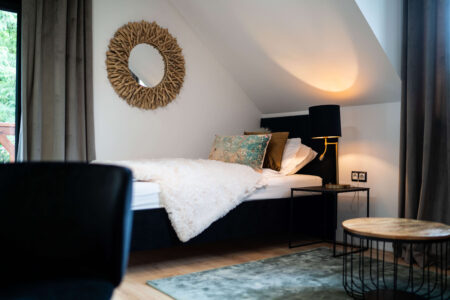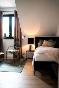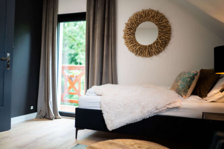 Przytulne pokoje znajdujące się na piętrze z dwoma łóżkami pojedynczymi (bez możliwości złączenia). Doskonałe do odpoczynku po aktywnie spędzonym dniu. Posiada balkon z widokiem na las.